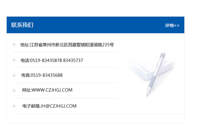 地址:常州市新北區友邦商務大廈1幢16、17層  電話:0519-85101652  傳真:0519-85112595  郵編:213022  網址:www.cz-jiayue_cn.jinyigg.com  郵箱:xiajifengaa@163.com